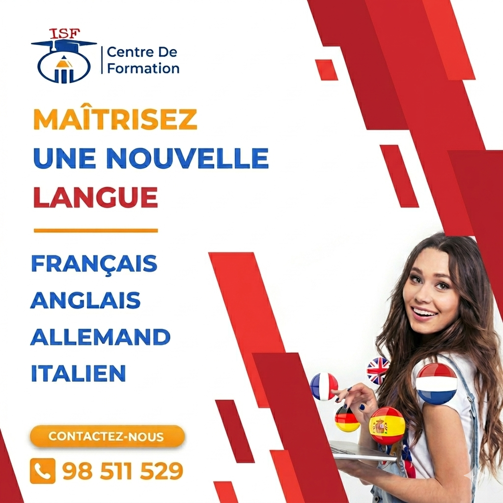 مستقبلك يبدأ بلغة جديدة مع ISF! تحب تفتح آفاق جديدة في خدمتك، قرايتك، أو تخمم تخرج لبرة؟ في مركز ISF، نوفرولك أفضل الدورات التكوينية في اللغات الأكثر طلباً:الفرنسية (Français)الإنجليزية (Anglais)الألمانية (Allemand)الإيطالية (Italien)علاش تختار ISF؟تكوين تطبيقي وفعّال يخليك تحكي بطلاقة.أساتذة كفاءة يرافقوك خطوة بخطوة.أوقات مرنة (حصص مسائية أو في نهاية الأسبوع) تناسب الناس الكل.ظروف قراية ممتازة وسط بيئة محفزة.ما تضيعش وقتك، سجل توّة واضمن بلاصتك.العنوان: 2 نهج انجلترا، تونسللمزيد من المعلومات أو للتسجيل، كلمنا على: 98.511.529أو ابعثلنا رسالة على الخاص (Messenger)ISF: طريقك نحو النجاح!